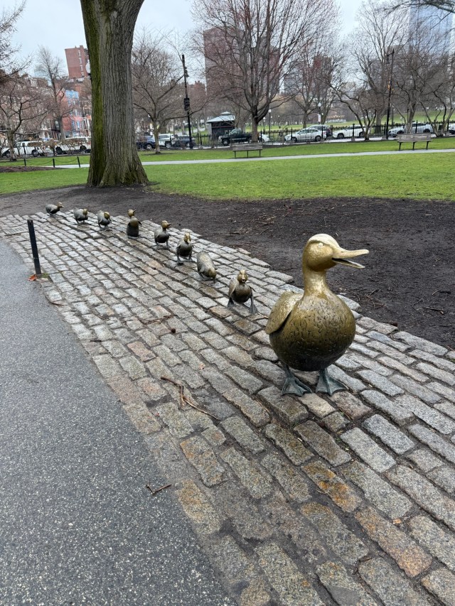 I had a bit of a whirlwind trip to the East Coast and back to celebrate Passover in Boston with family. It was lots of fun, but I never did quite adjust to the time zone differences! The weather was pretty cold while we were there, so we bundled up to spend time wandering around and exploring. We just happened to come across the Make Way For Ducklings statues! (My daughter and I were delighted — but apparently the rest of our group missed out on the picture book as kids and didn’t get what the fuss was about).