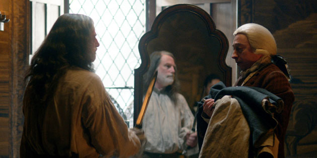 Claire finds out that a young boy has died, supposedly killed by demons after playing at the “black kirk”. Uh oh! Mrs. Fitz’s nephew Thomas was good friends with the boy who died. Young Thomas summons Claire to Colum’s chambers, where the Laird is busy terrorizing a tailor whose work was not up to standards. Colum then asks Claire to massage him in order to relieve the pain he experiences from his deformed legs. Claire complies, and the two share a less tense moment than they have so far. In gratitude for her skilled hands, Colum invites Claire to be his guest in the hall that night to hear a visiting singer.