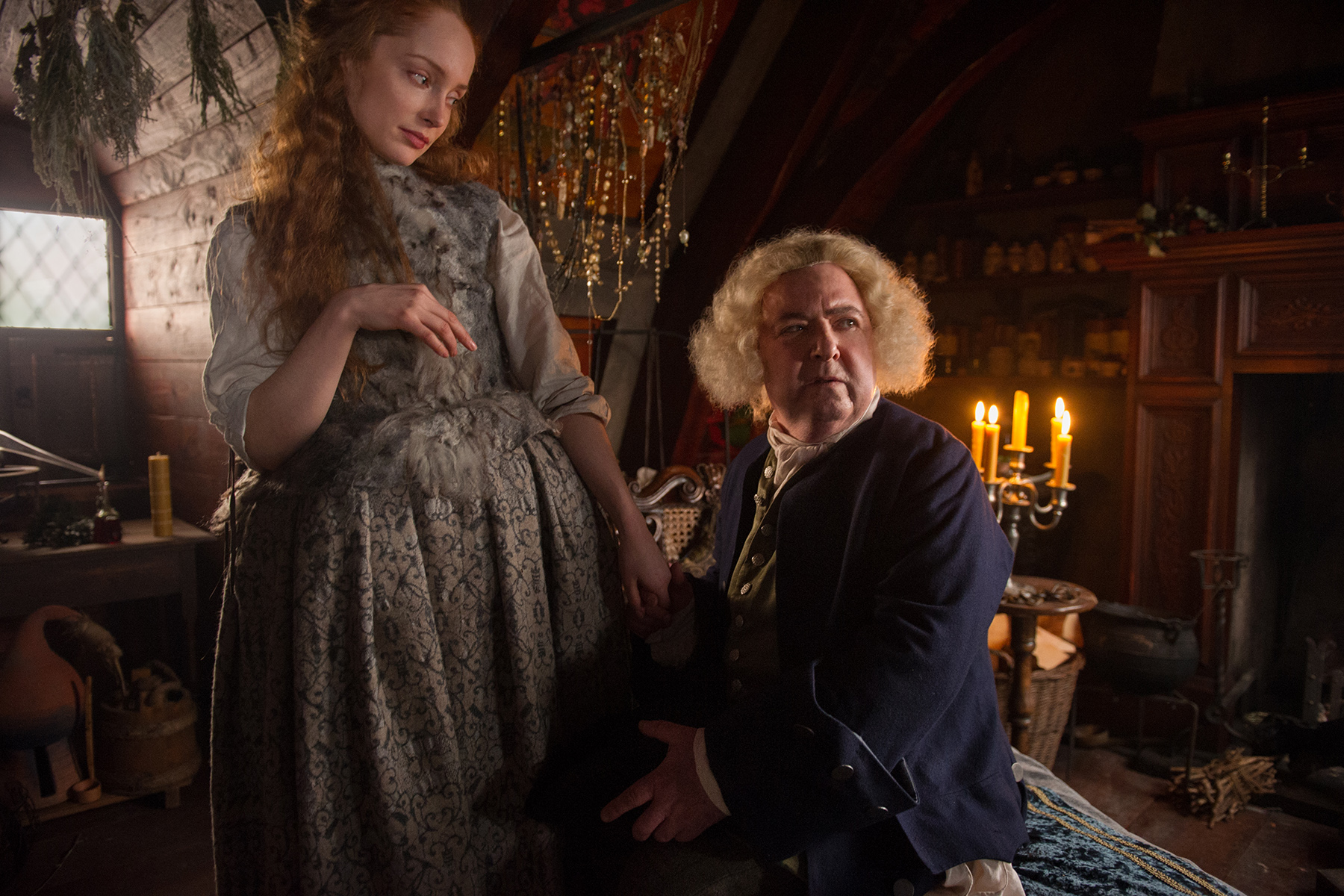 Geillis takes the prize for this episode, though, with that crazy furry top of hers (that she seems to keep petting)…