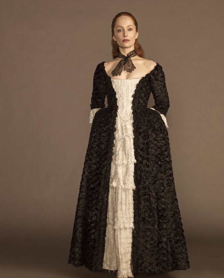 Claire looks amazing with her fur cowls and cloaks, but Geillis really takes the cake in this episode. From her filmy shawl in her woodland ritual to the point-hooded cloak in the woods to her black-and-white dress at the end, Geillis continues to have one of the most unique looks on the show.