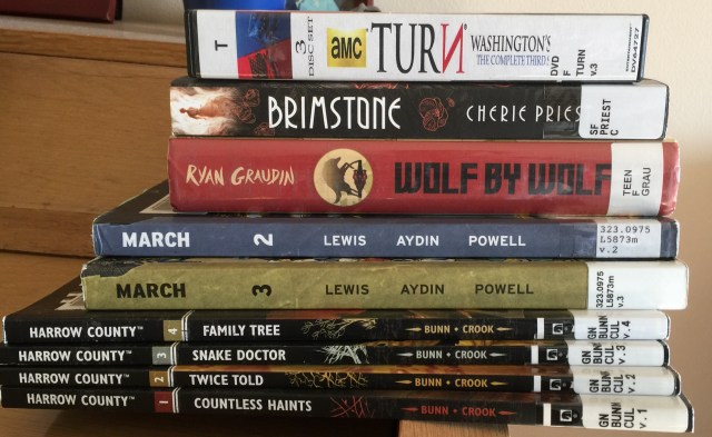 Quite a library haul this week: I came home with one DVD set, six graphic novels (from two different series), and two novels. Do I have time to read all of these? Maybe. But I’m excited to at least have the possibility.