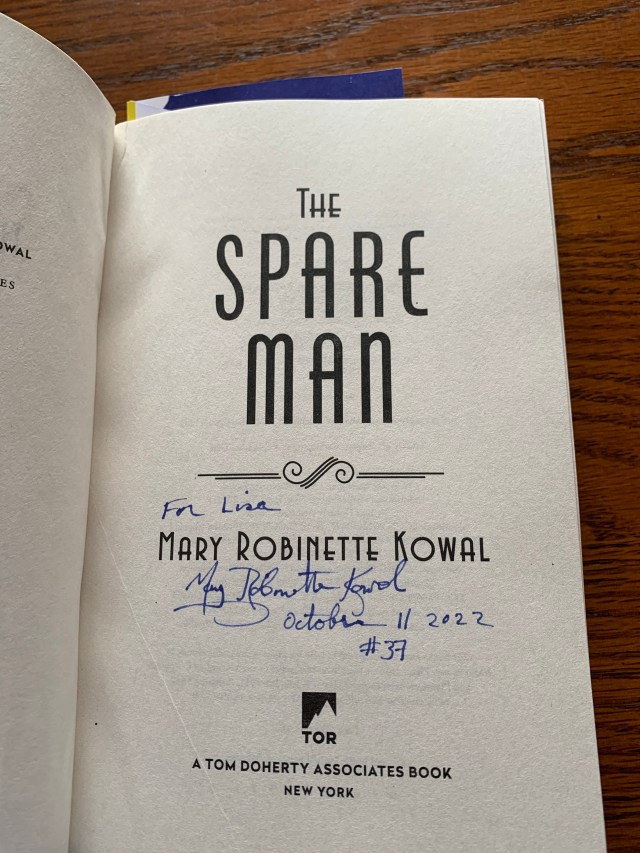 Also, I ordered a signed copy of Mary Robinette Kowal’s new novel, The Spare Man, from her local bookstore, and it arrived over the weekend, along with fun swag: